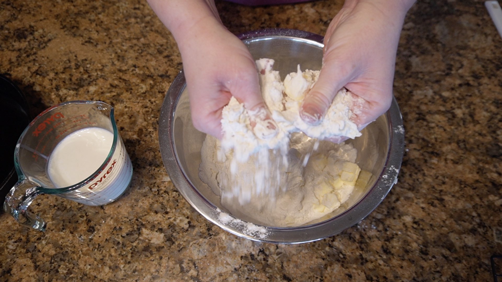 When making pone, we will use the rub-in method to combine the flour mixture with the butter. This creates a short, crisp dough that will give you a tender and flaky bread. You want to work quickly so that the butter doesn’t melt too much and you have a fluffy interior. You can also pulse this in a blender, food processor, use knives, a fork or pastry blender. We find it easier to use our hands as it’s less cleanup and only takes a couple of minutes.