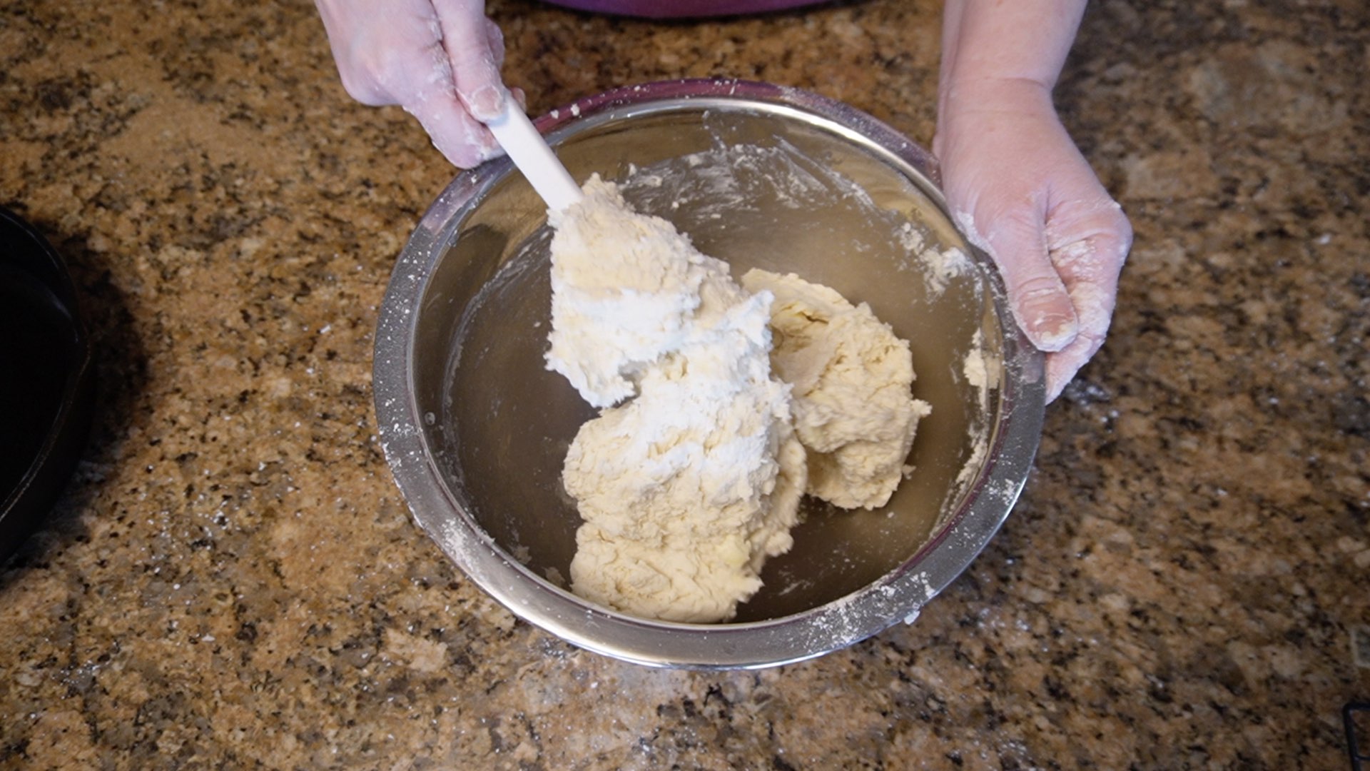 - This will be a sticky dough. Do not add more flour or it will become tough and dense.