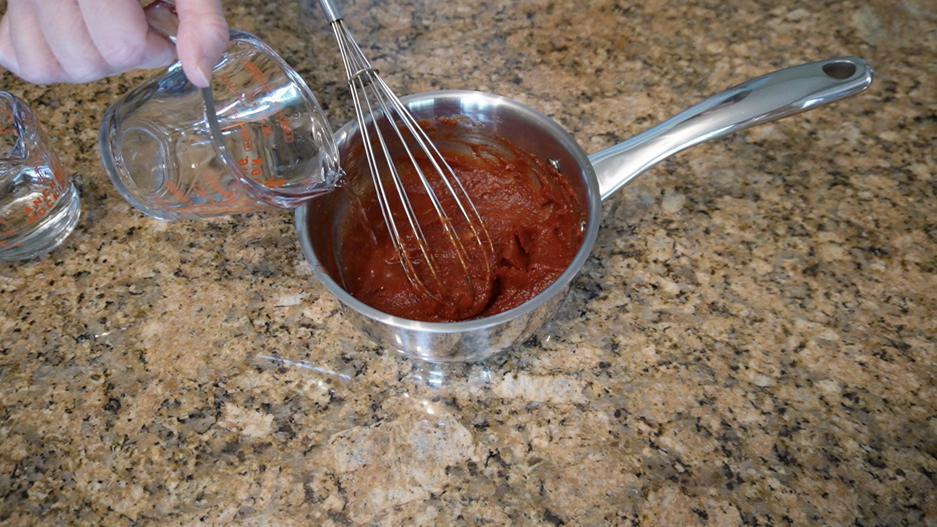 • In a small to medium sized sauce pan, whisk* together the sugar, tomato paste, onion powder, garlic powder and salt.